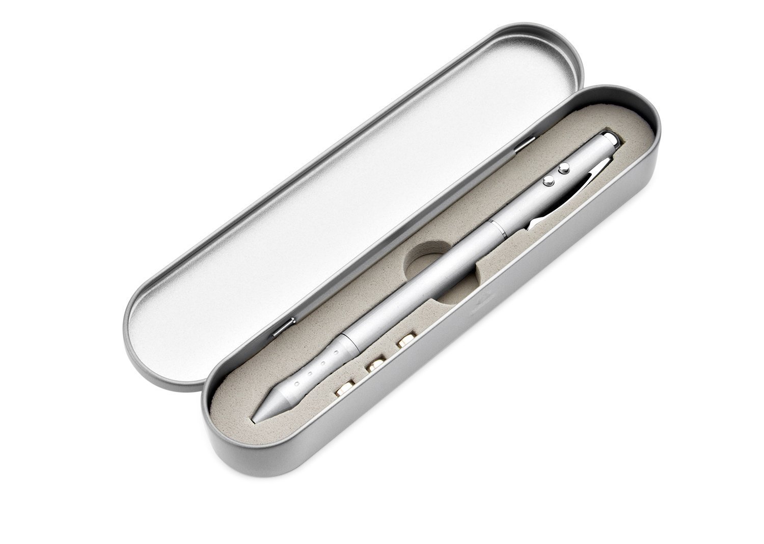 Bolígrafo con Linterna y láser, sistema de apertura Twist, incluye estuche metálico Individual y 3 pilas de repuesto. Útil como herramienta práctica para presentaciones, enseñanza, reuniones, discursos y capacitaciones. Puntero para pantallas Resistivas que normalmente son de uso profesional y de precisión. Como dispositivos bancarios por ejemplo.