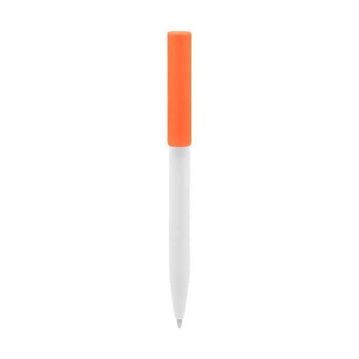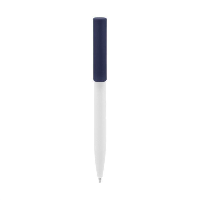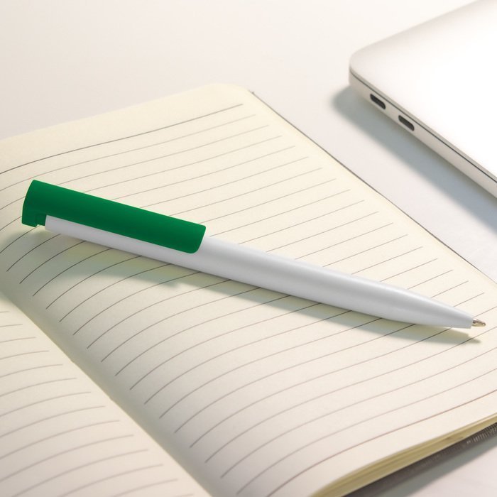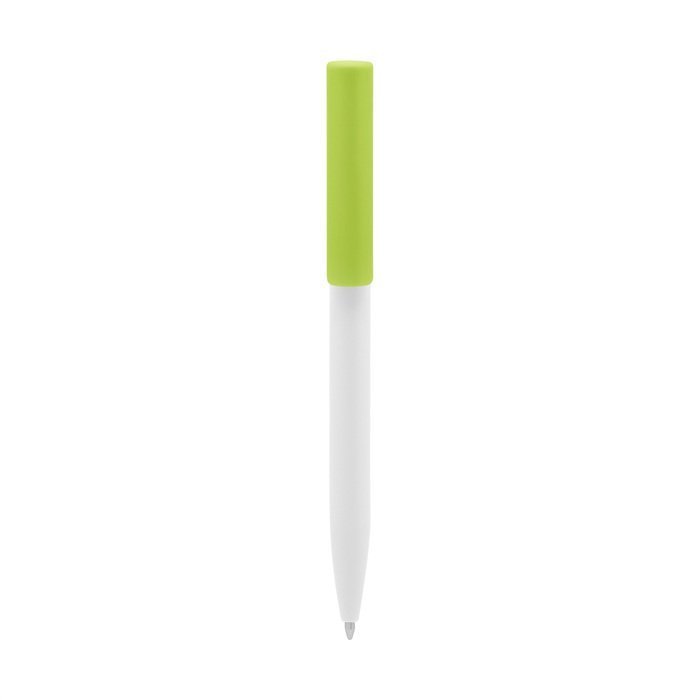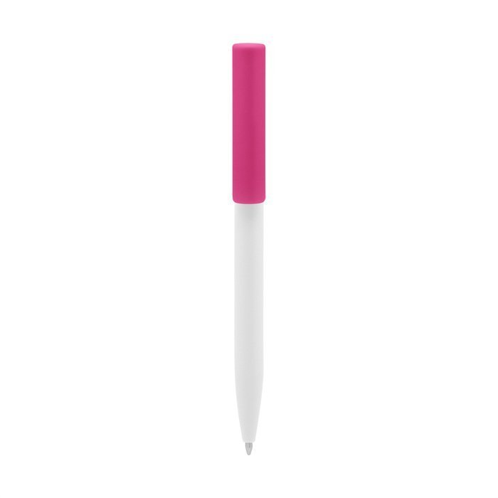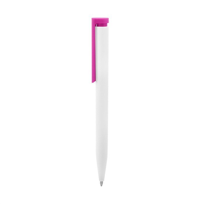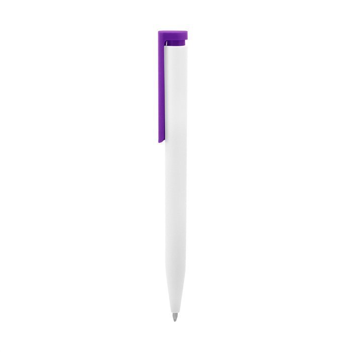Plástico. Cuerpo blanco y clip de diferentes colores. Bolígrafo retráctil. Clip plástico de colores. Tinta negra. Sistema de botón push para destapar. Amplia área de impresión.