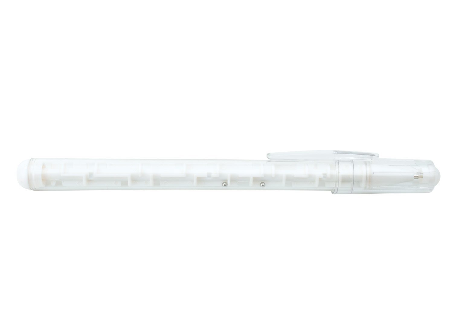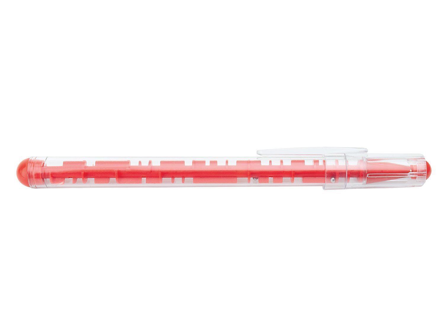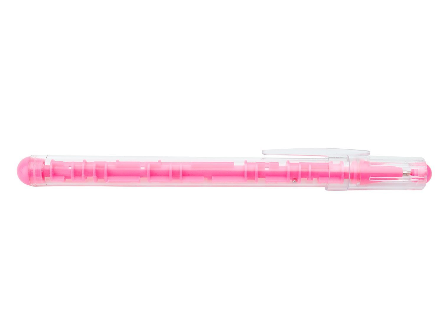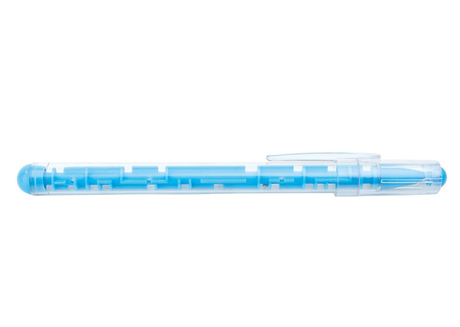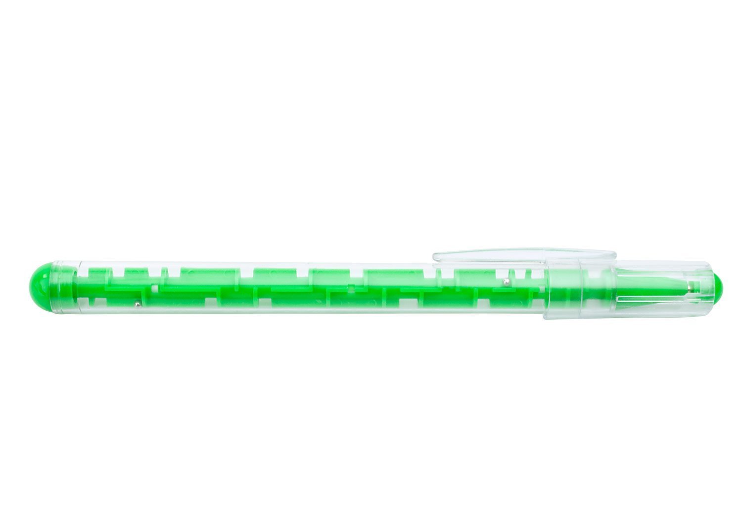 Bolígrafo plástico con tapa, en la parte interna tiene un jueego para disfrutar mientras se utiliza