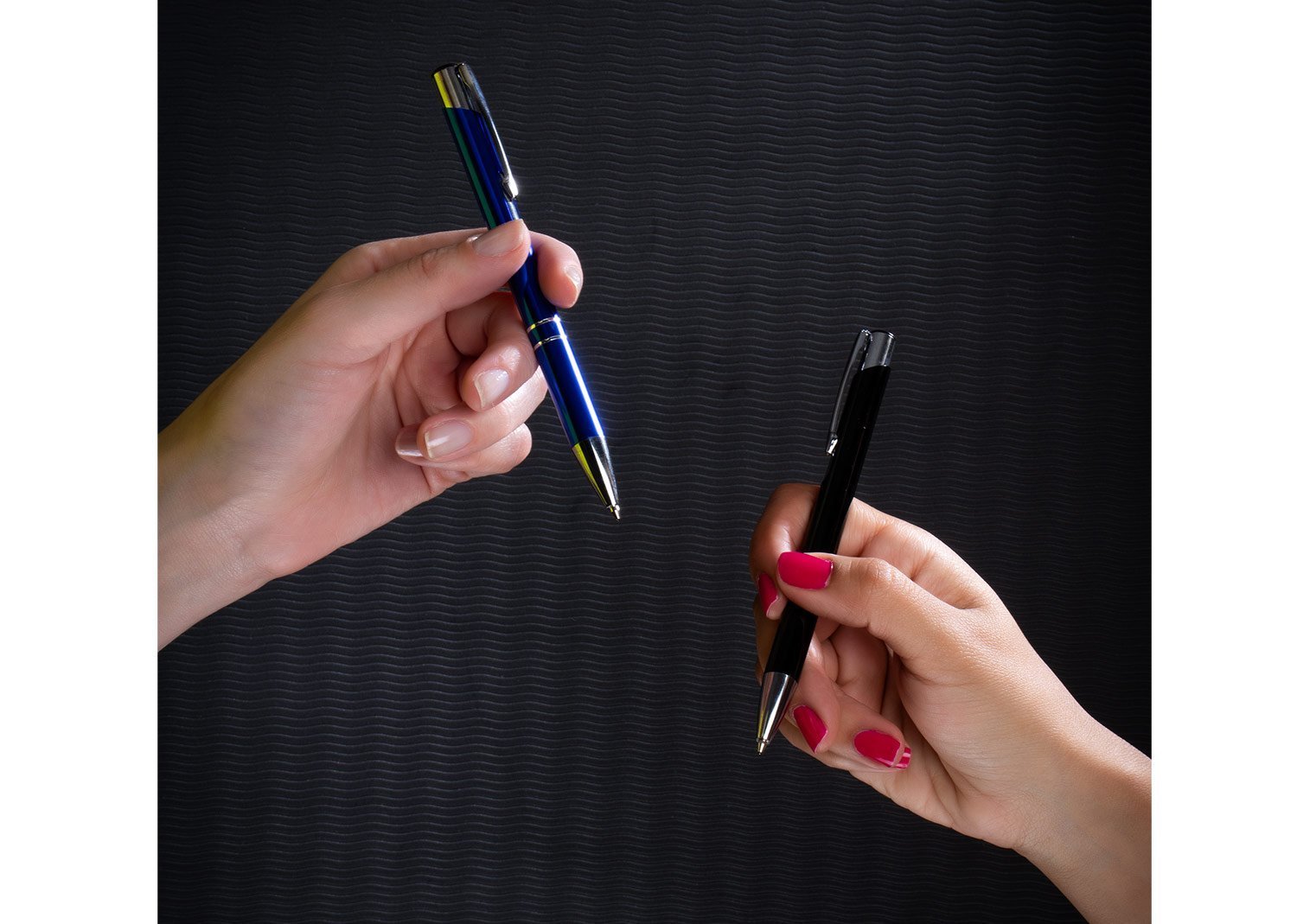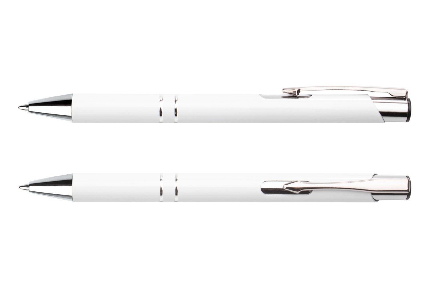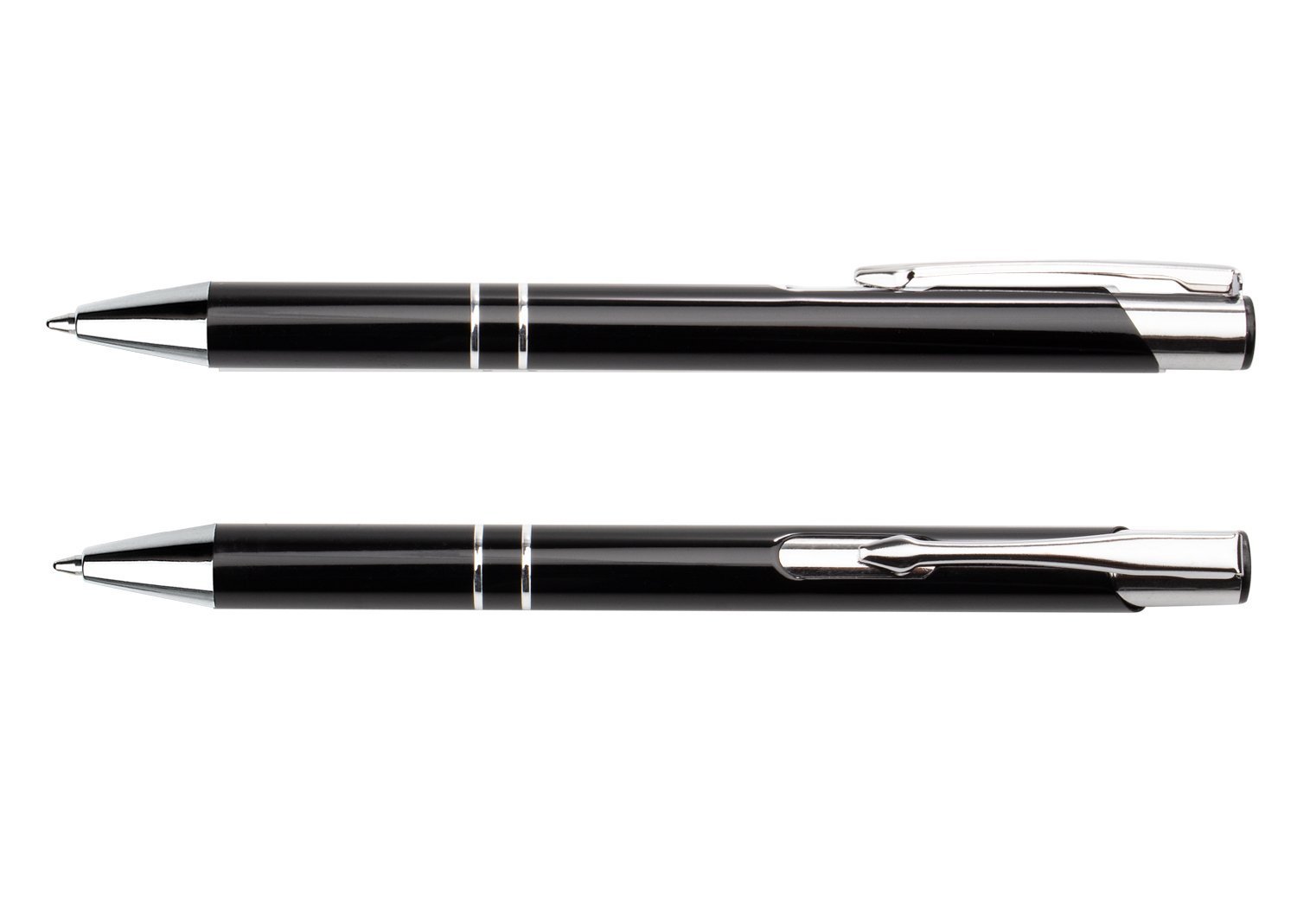 Bolígrafo con sistema de apertura retráctil y clip metálico.