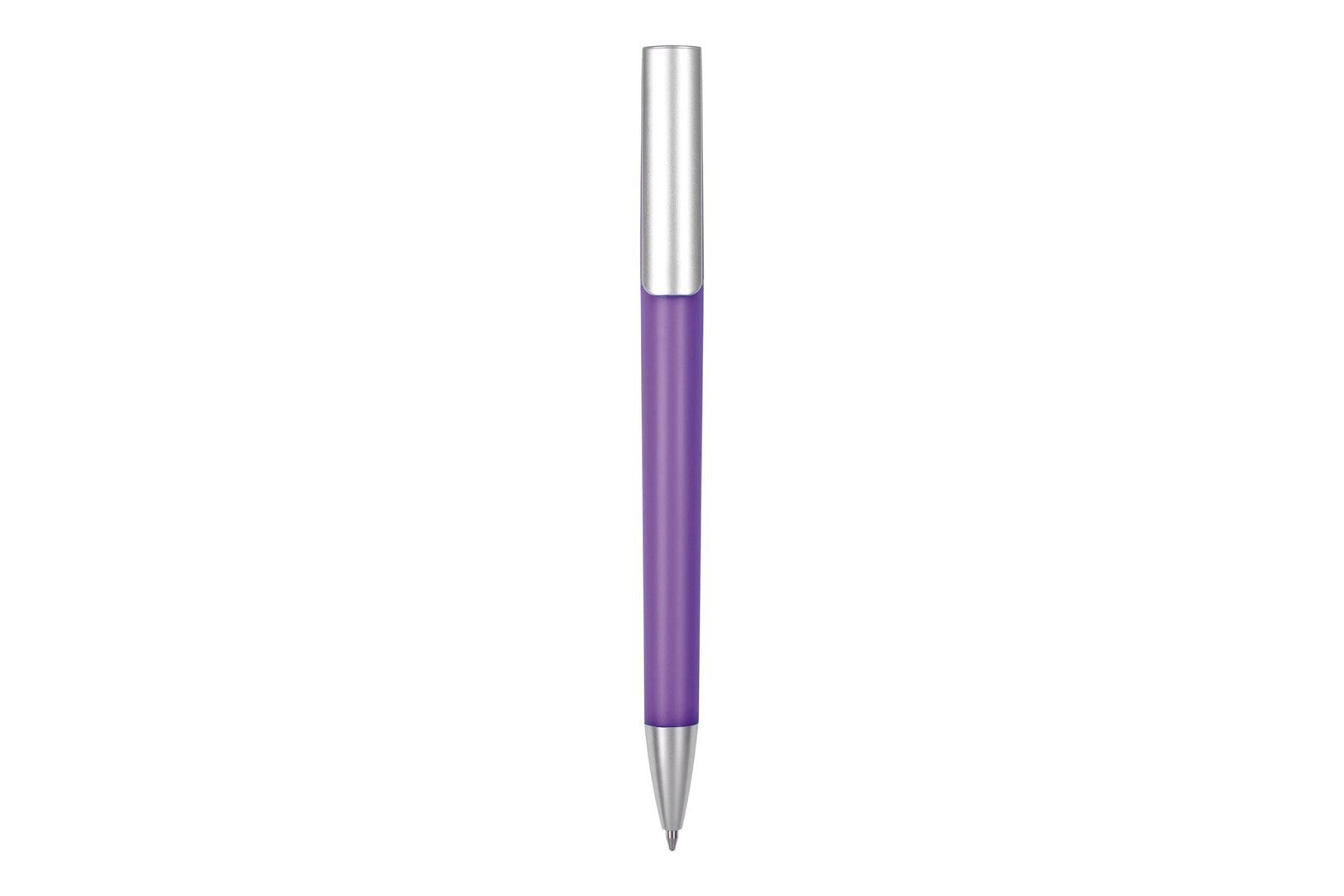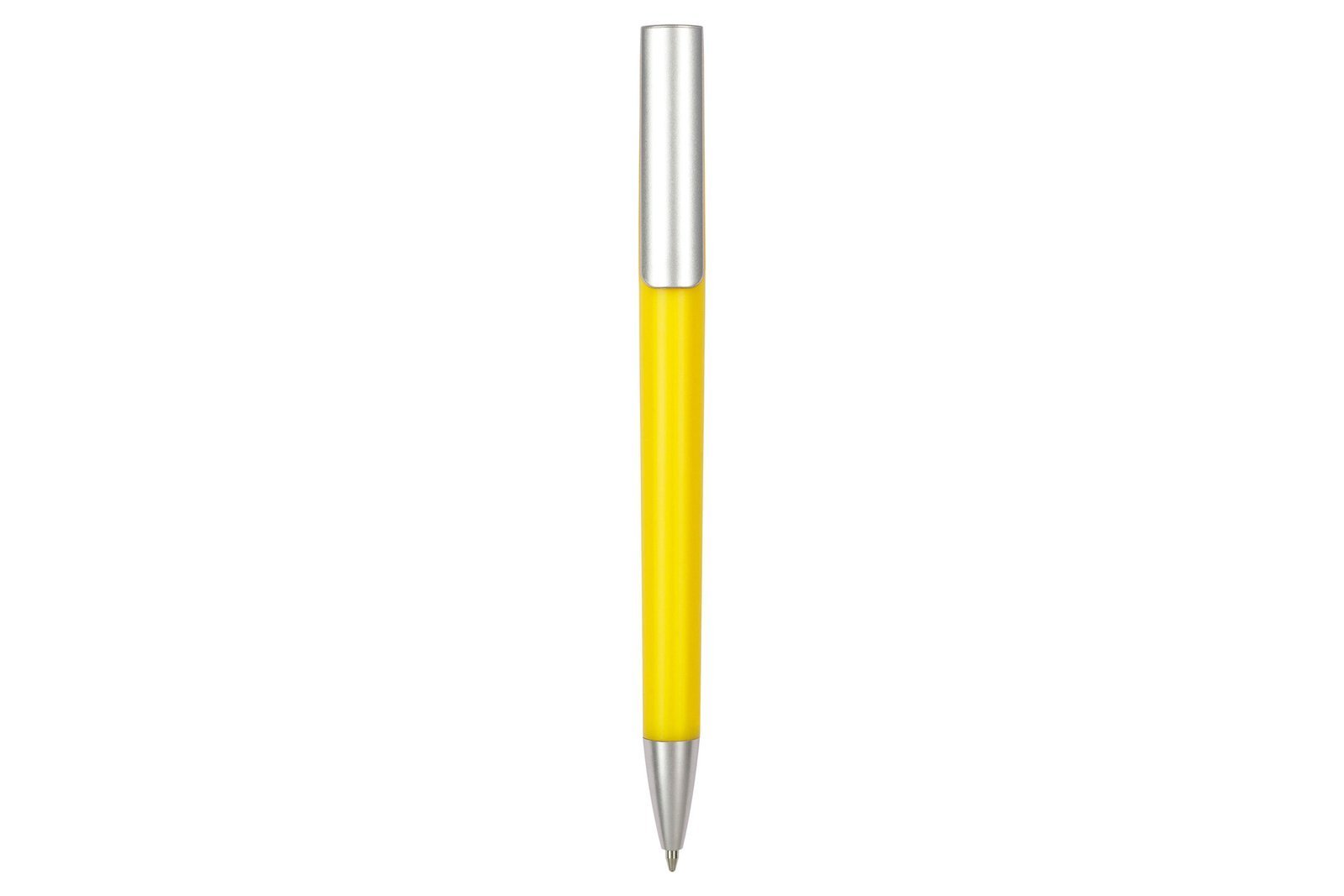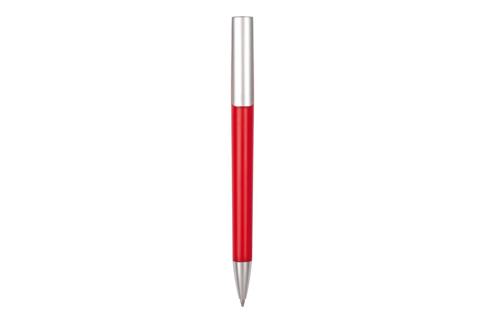 Bolígrafo plástico . Cuerpo de color. Detalles de color plata en clip y puntera. Apertura giratoria. Tinta negra.