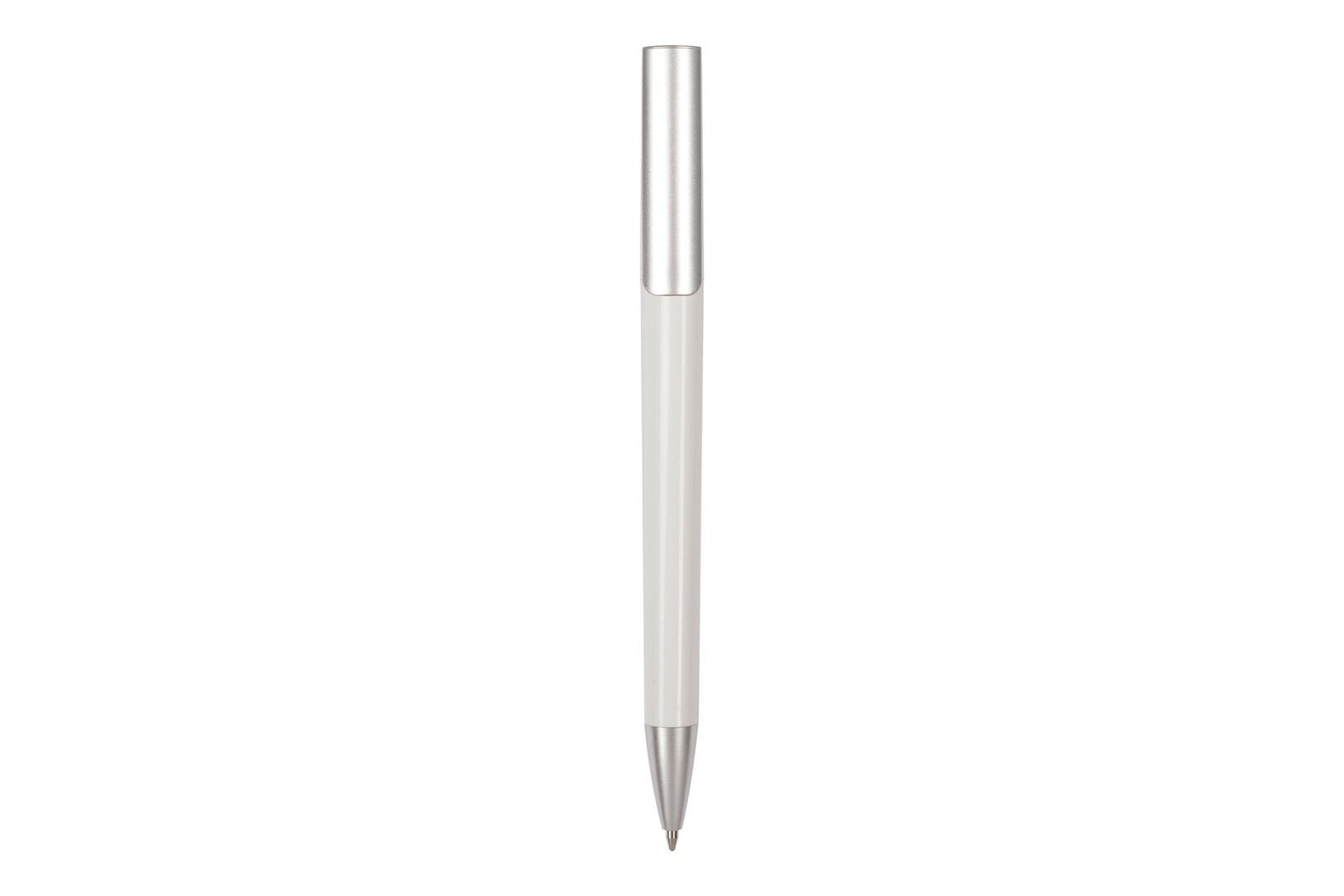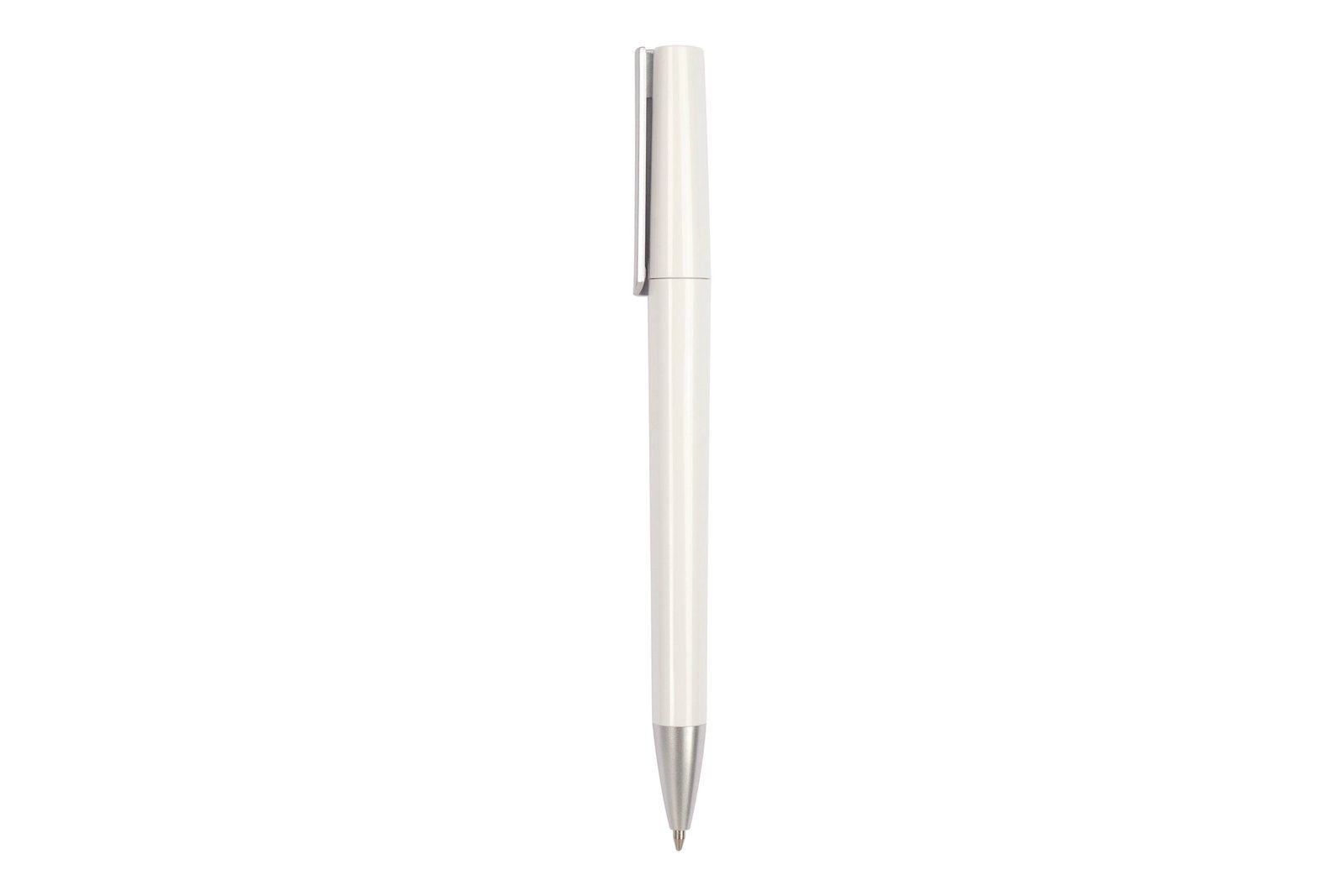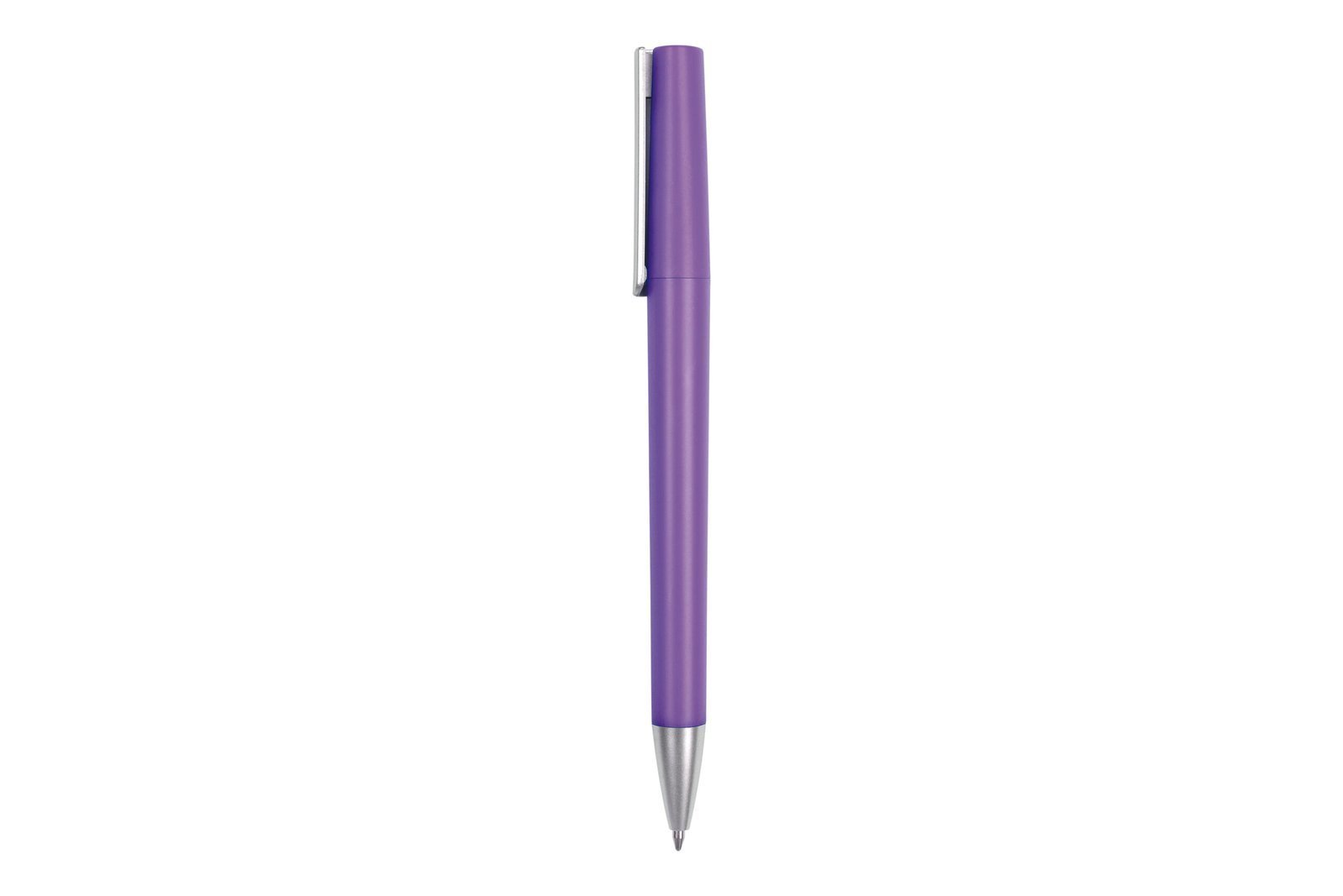 Bolígrafo plástico . Cuerpo de color. Detalles de color plata en clip y puntera. Apertura giratoria. Tinta negra.