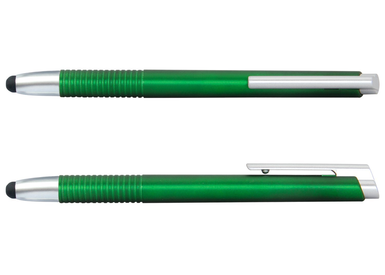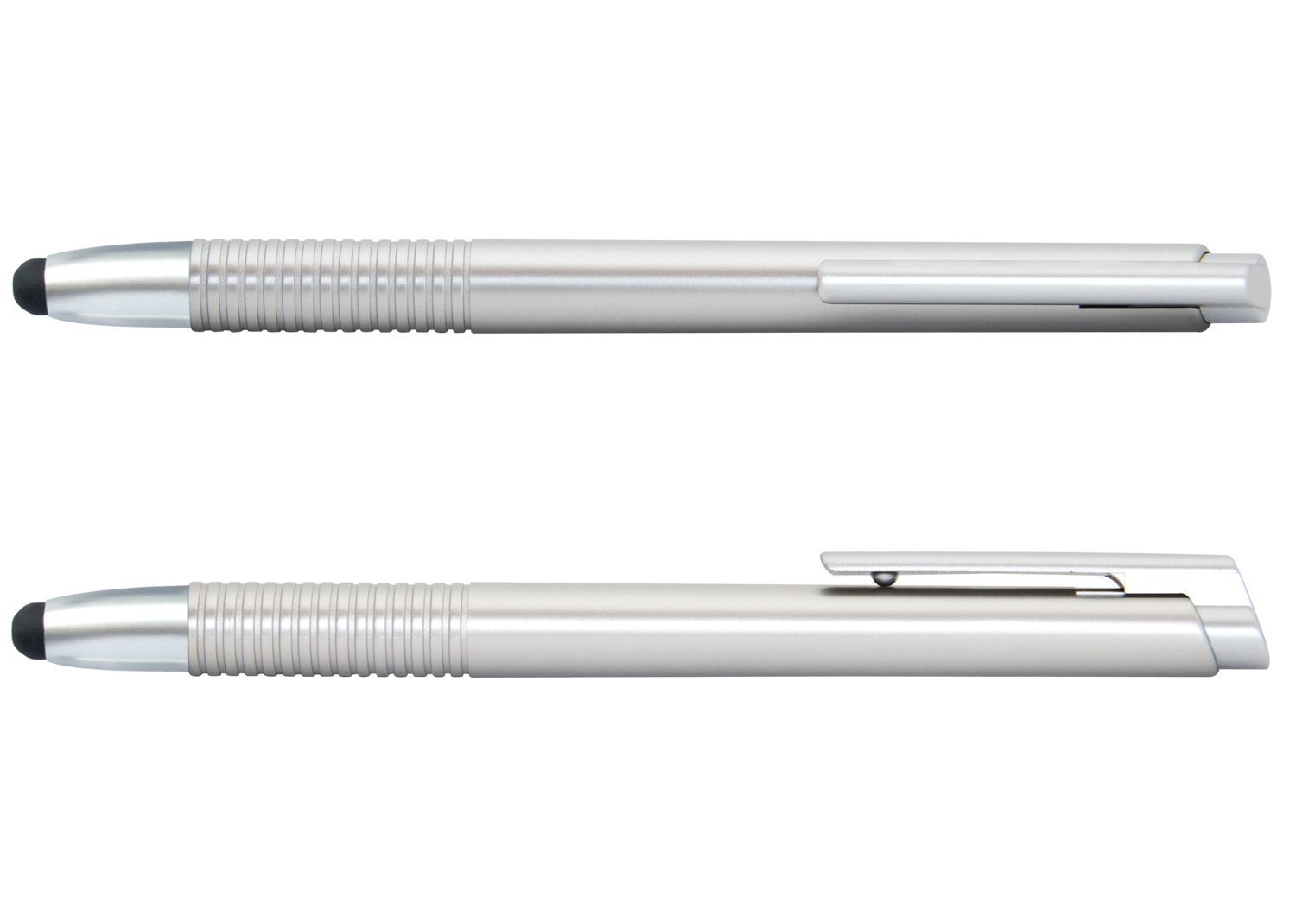 Bolígrafo retráctil con acabado mate, clip y punta plateados, stylus en la punta para dispositivos de pantalla táctil.