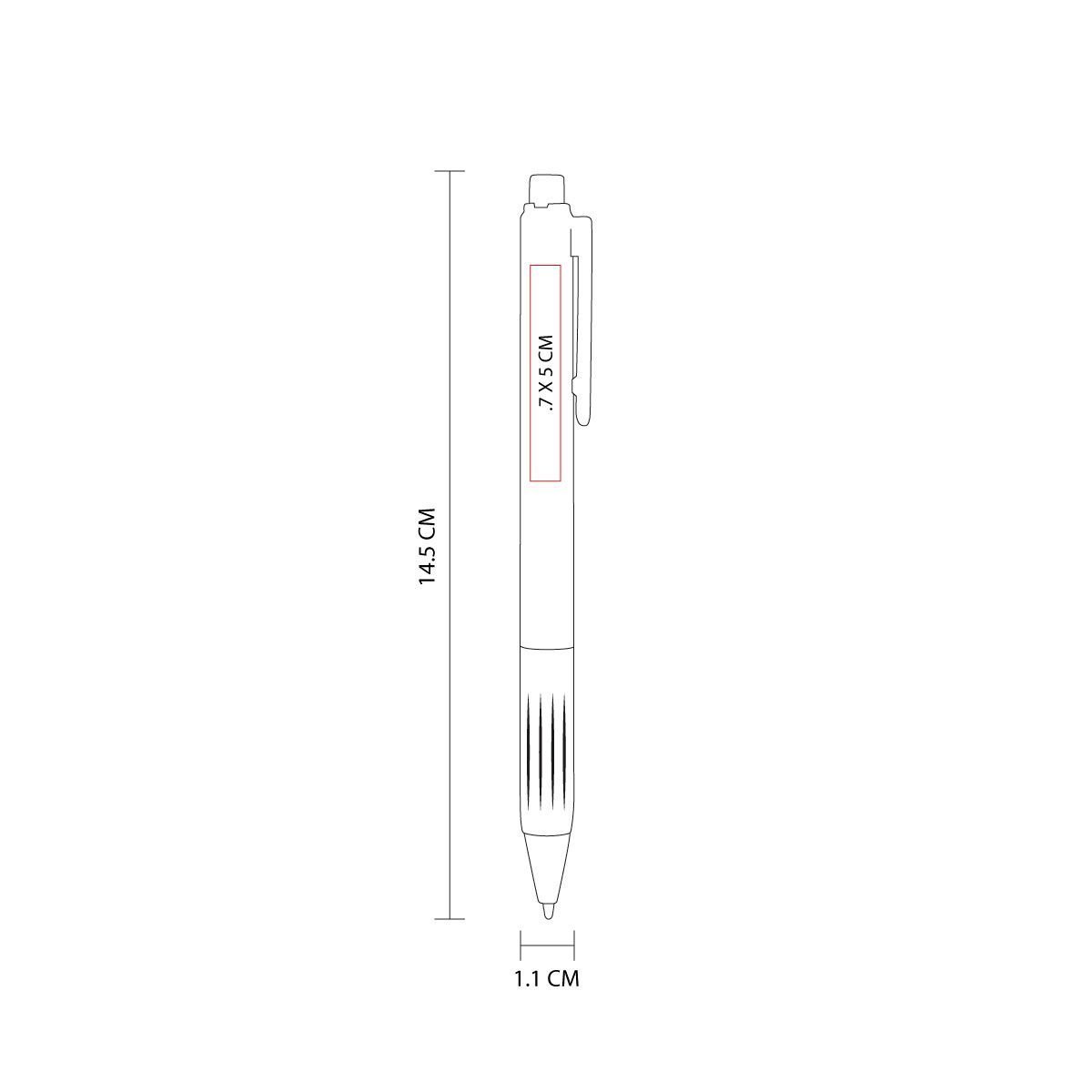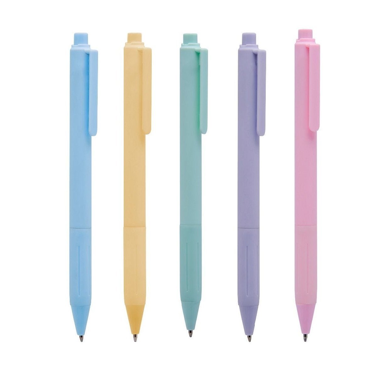Bolígrafo en colores pastel. Grip de silicón antiderrapante. Mecanismo pulsador.