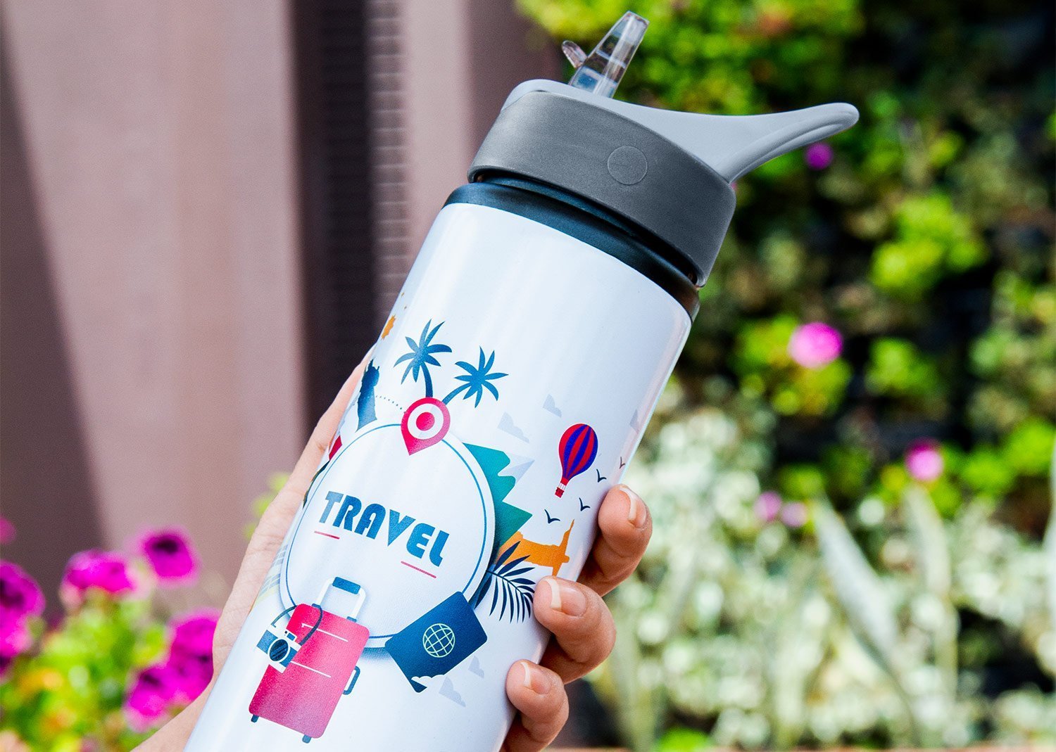 Botella en aluminio con tapa rosca y pitillo ajustable, manija plástica incorporada para transporte. Capacidad 730ml. Peso: 120g. Temperatura recomendada: 10℃ a 100℃.