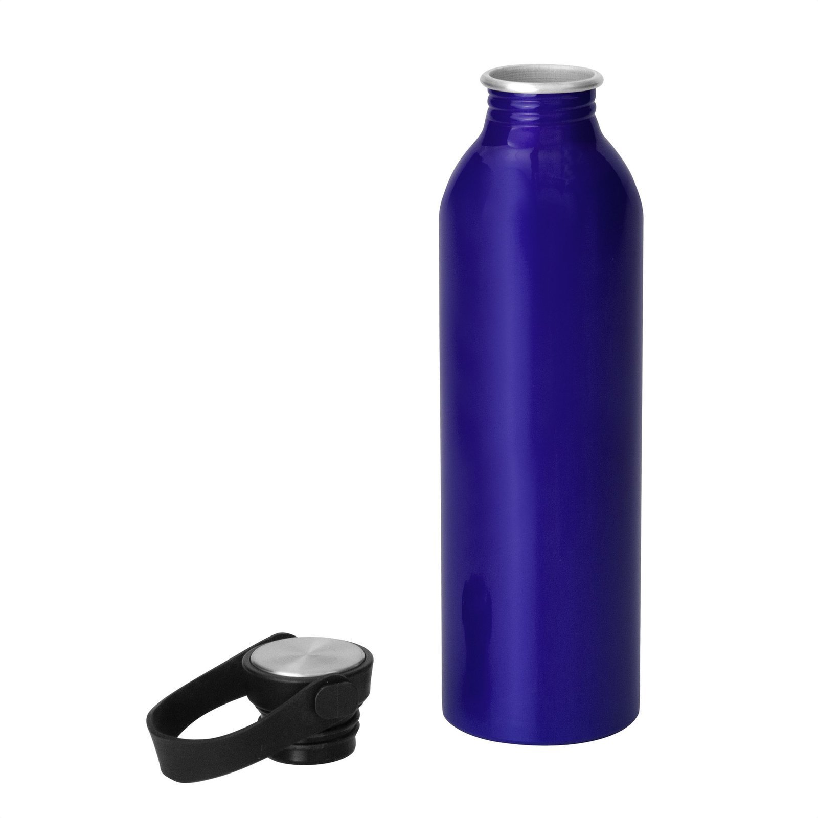 Botella de aluminio con acabado brillante. Tapa a rosca de acero inoxidable 201 y PP, con tira de silicona color negro.