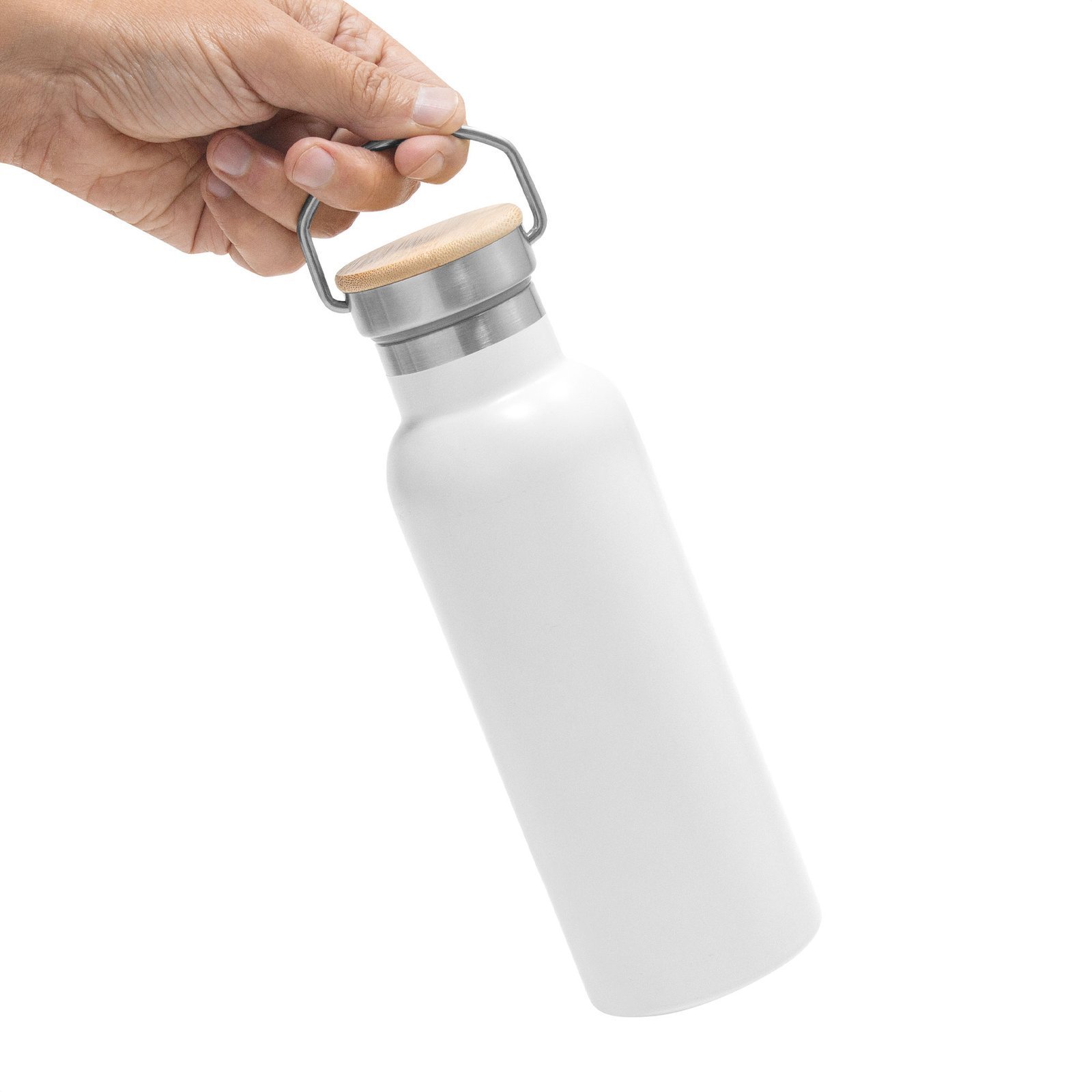 7,2 x 22,3 cm. Capacidad 550 ml. Acero inoxidable. Botella con aislamiento térmico vacuum. Interior en acero 304 y exterior en acero 201. Tapa de acero inoxidable con manija metálica rebatible y detalles en bambú. Anillo de silicona antiderrame. Mantiene por más de 12 hs la temperatura de las bebidas calientes y 24 hs de las bebidas frías. Presentación en caja de regalo Kraft.