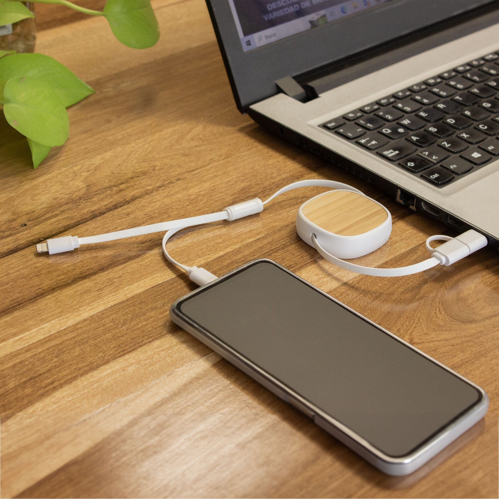 5,3 x 1,5 x 22,5 cm. Bambú / ABS. Cable de carga retráctil con longitud de hasta 85 cm. Posee un conector Lightning, dos conectores USB-C y un conector USB standard. Presentación en caja de regalo kraft.