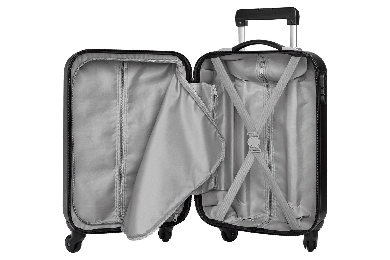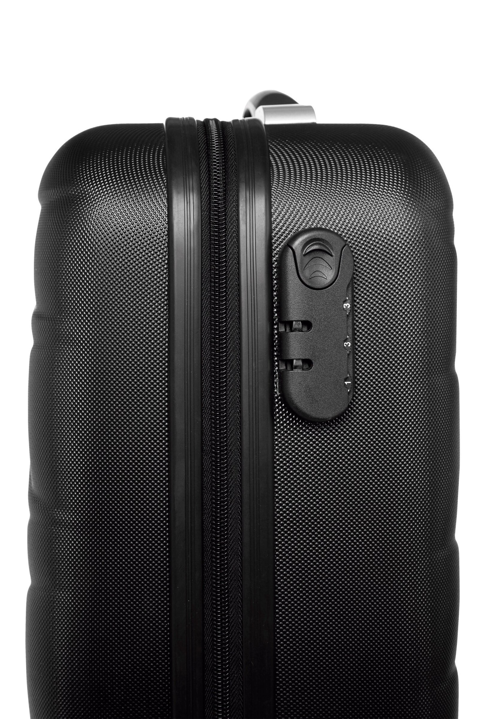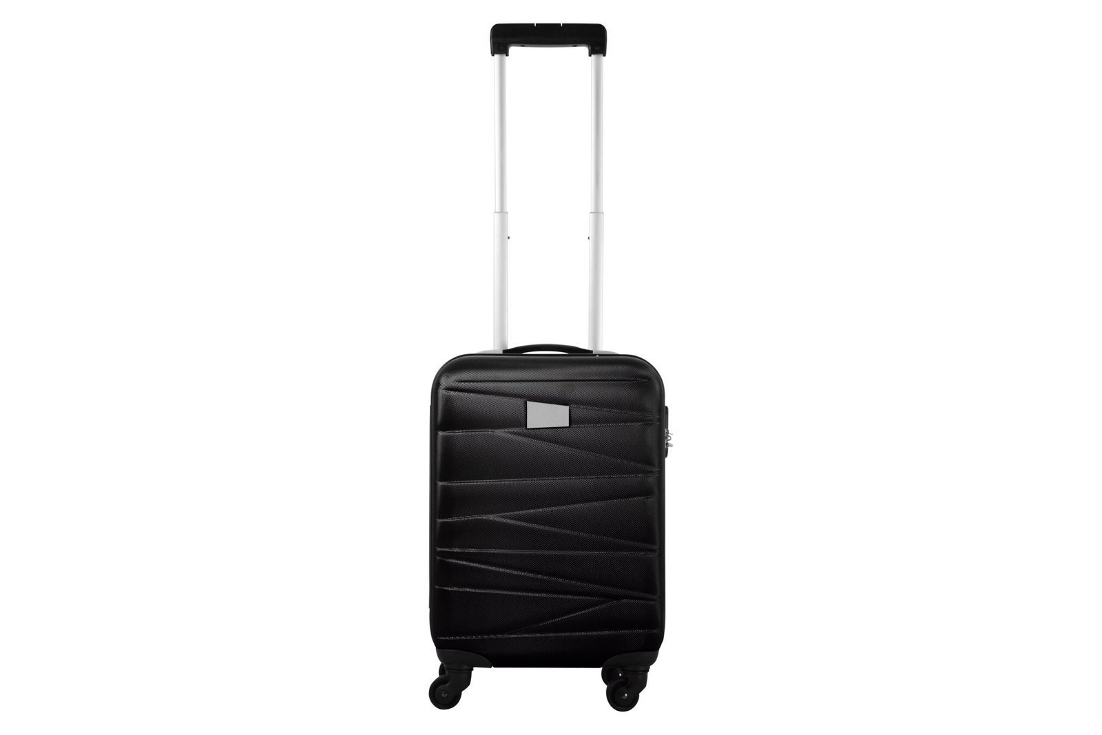 54 x 34 x 20 cm. (total). Capacidad 31 litros. ABS. Valija / Maleta pequeña. 4 ruedas con giro 360°. Manija de transporte reforzada. Mango extensible hasta 54 cm. 2 posiciones. Interior: 2 compartimentos principales con cierre y elásticos ajustables. Placa metálica desmontable para grabado (medida: 6 x 4 cm.) Candado incluido con combinación.