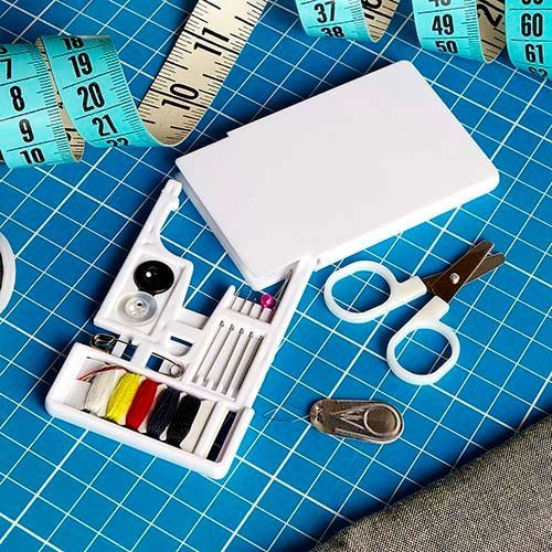 Tapa deslizable. Incluye tijeras, botones, ensartador de aguja, alfiler, hilo, agujas y seguro.