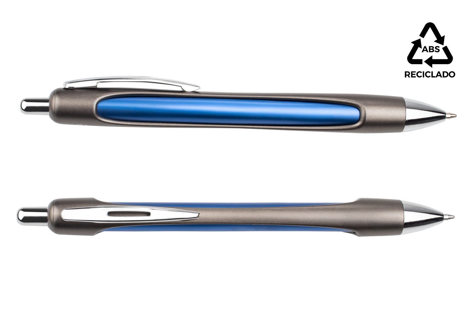 Bolígrafo de acción retráctil con diseño metálico y materiales reciclados. Cuerpo exterior en ABS reciclado con acabado metálico, interior de aluminio reciclado. Clip, botón y punta cromados. Incluye recambio tipo Parker de plástico. (Bolígrafo/Esfero)