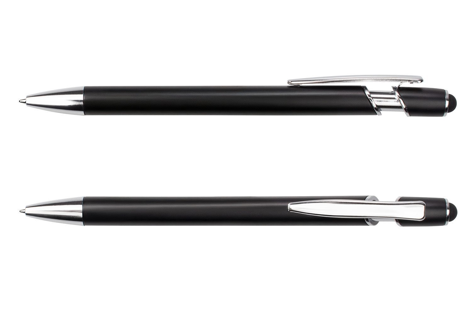 Bolígrafo de diseño moderno con barril y empujador de color metálico. Incorpora clip y adornos en metal cromado, que aportan un acabado elegante. En la parte superior, cuenta con función stylus compatible con pantallas táctiles. Mecanismo retráctil para mayor comodidad y funcionalidad.