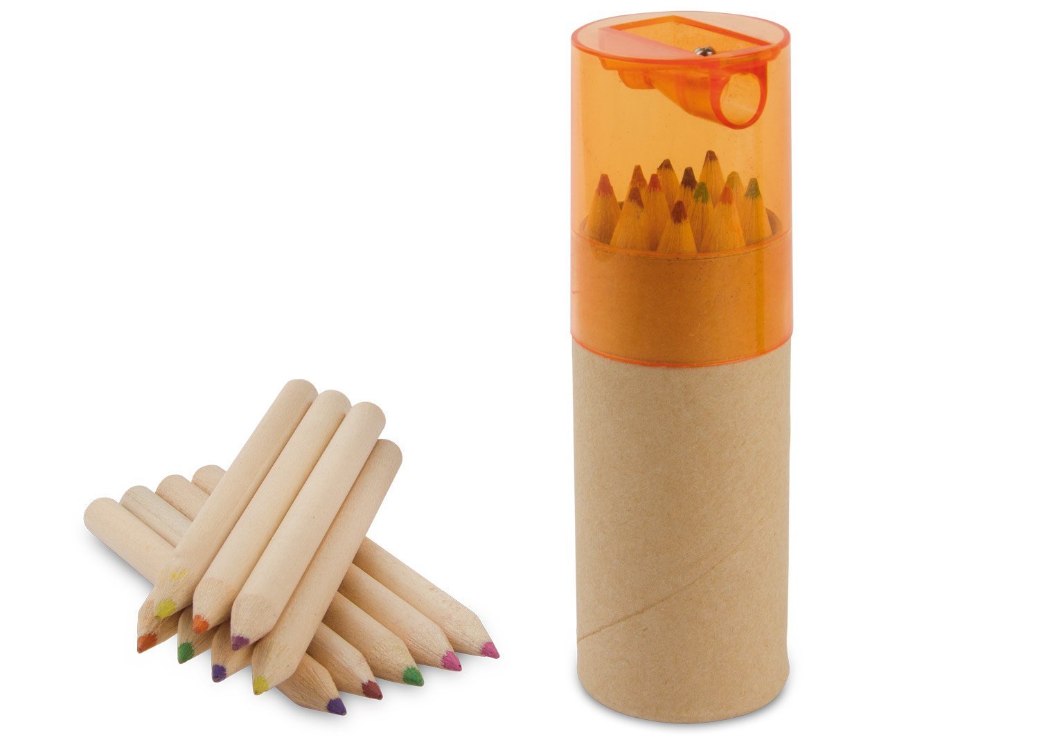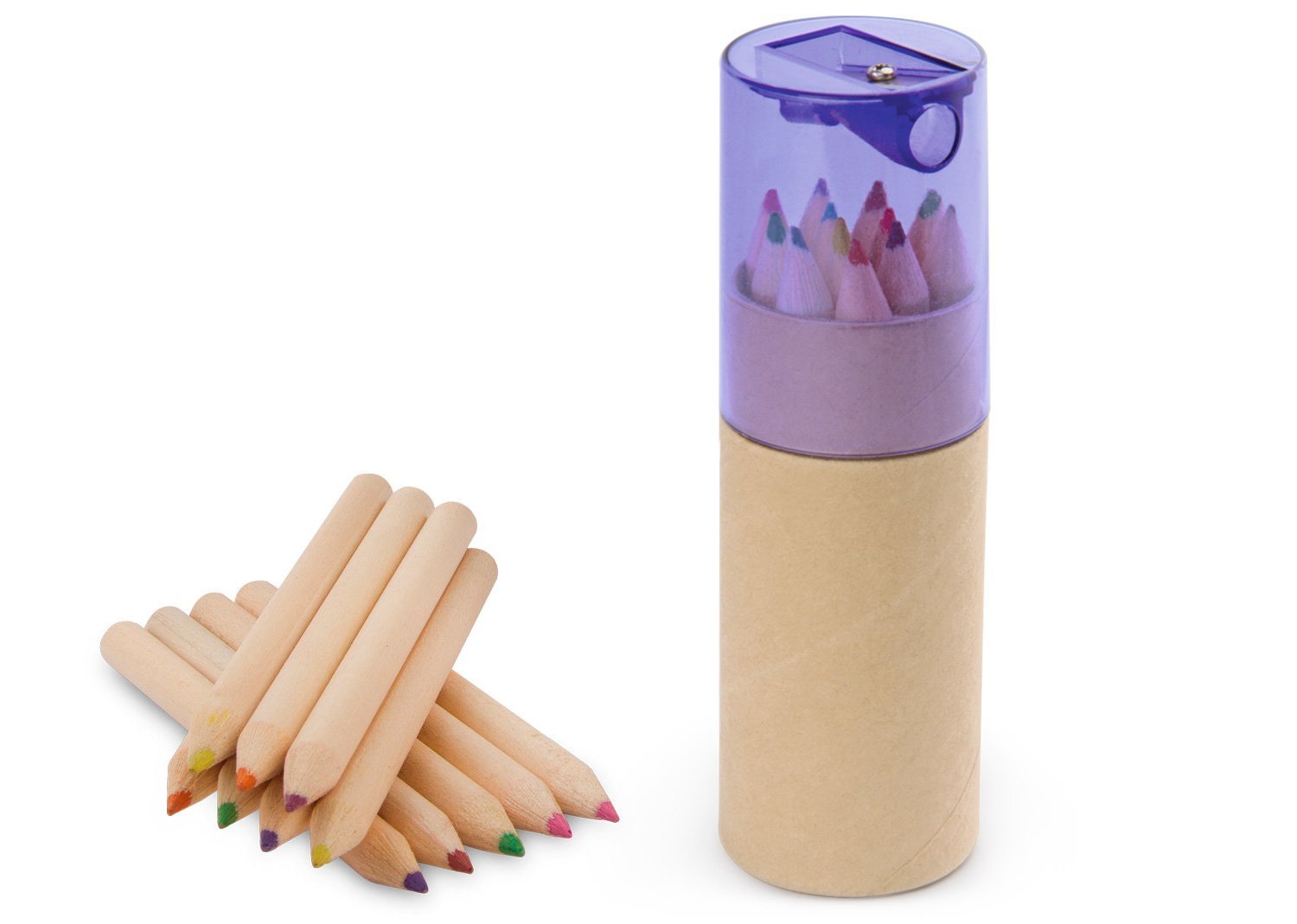 Estuche en cartón cilíndrico que contiene 12 colores de madera y tapa con tajalápiz.