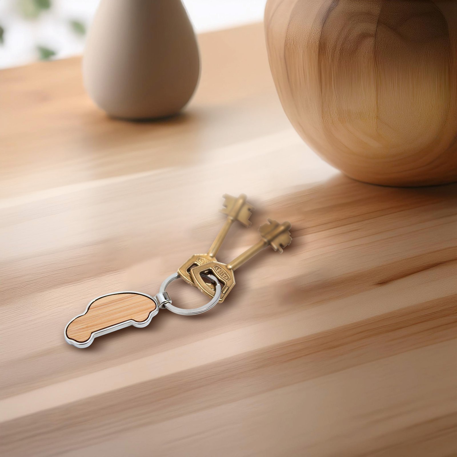 Llavero con forma de auto. Estructura metálica con aleación de zinc con acabado brillante y panel frontal de bambú barnizado.