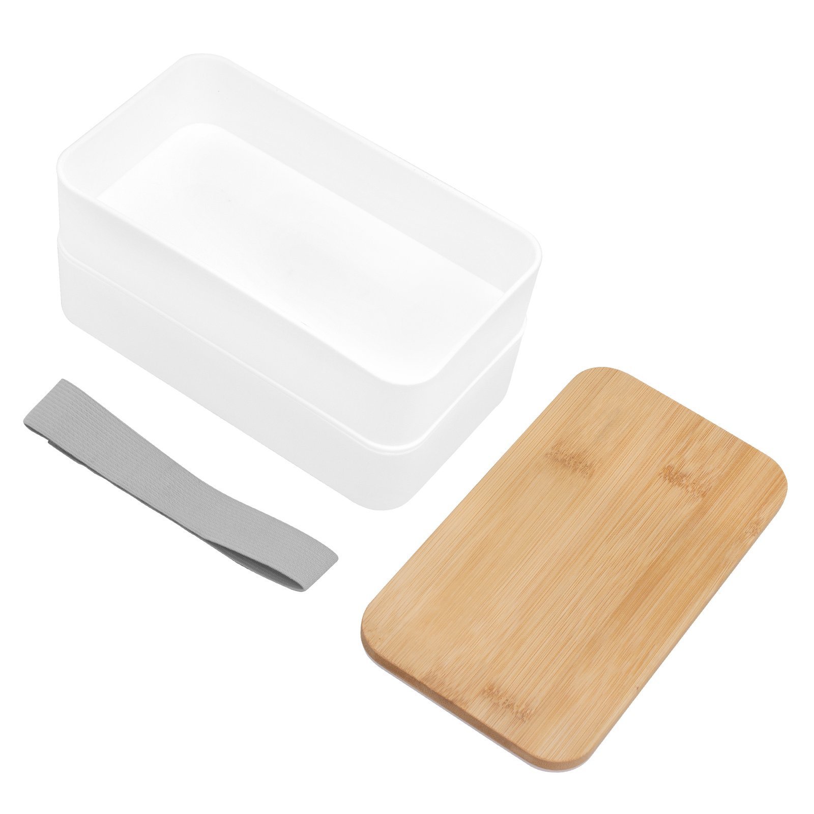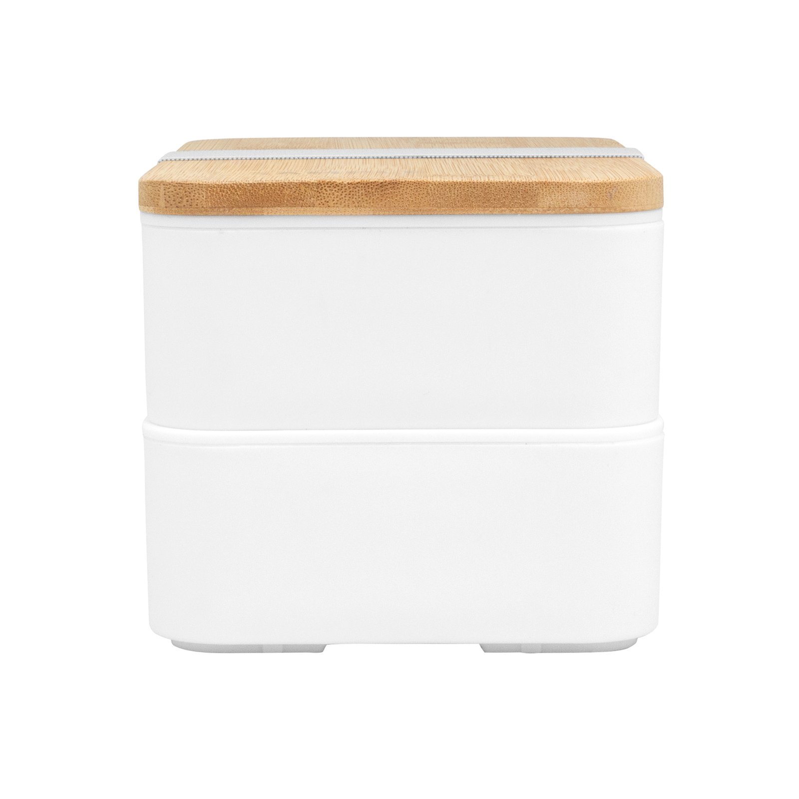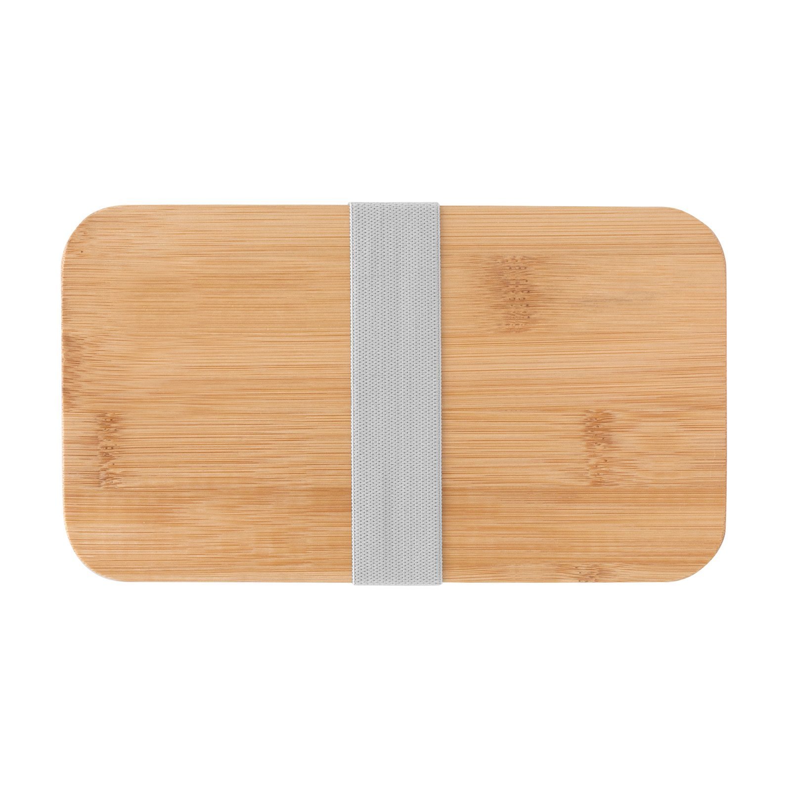 Contenedor de alimentos con tapa de Bambú. Posee dos compartimentos plásticos, un separador y bandeja porta set de 3 cubiertos (cuchillo, tenedor, cuchara). La tapa de bambú debe presionar firmemente la bandeja donde se fija el juego de cubiertos. Cierre con sujeción elástica color gris. Producto apto para microondas (sin la tapa). Importante: solo se puede calentar la comida, NO sirve para cocinarla.