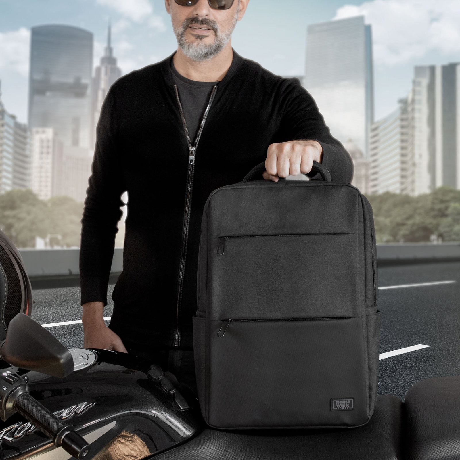 28 x 41 x 12 cm. Capacidad 14 litros. Poliéster wulong 300D. Interior forrado en 210D. Morral portanotebook de hasta 15 pulgadas. Compartimento principal con bolsillo acolchado para la notebook y bolsillo organizador. Frente con 2 bolsillos horizontales con cierre y 2 bolsillos laterales. Forro Nomawalk impreso negro. Asa superior, correas y respaldo acolchados. Correas ajustables. Tira para sujetar la mochila en la manija extensible de un equipaje de mano. Tiradores de cierres metálicos color negro.