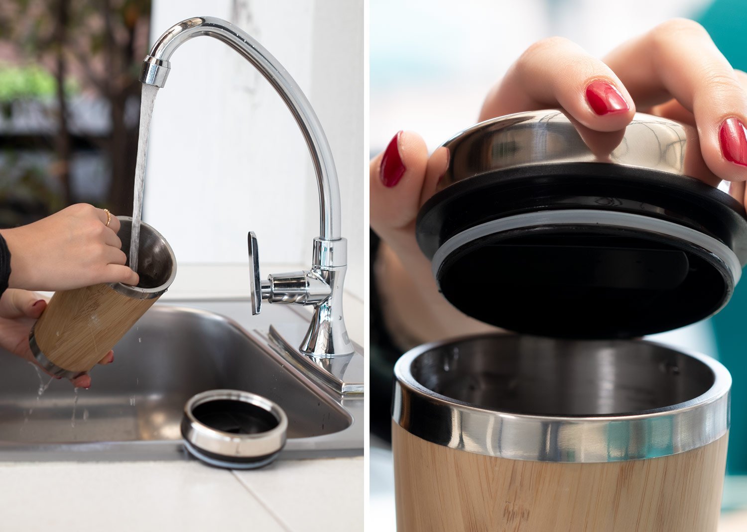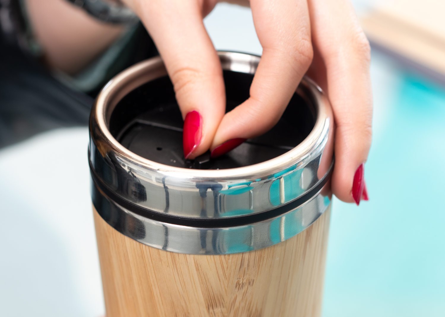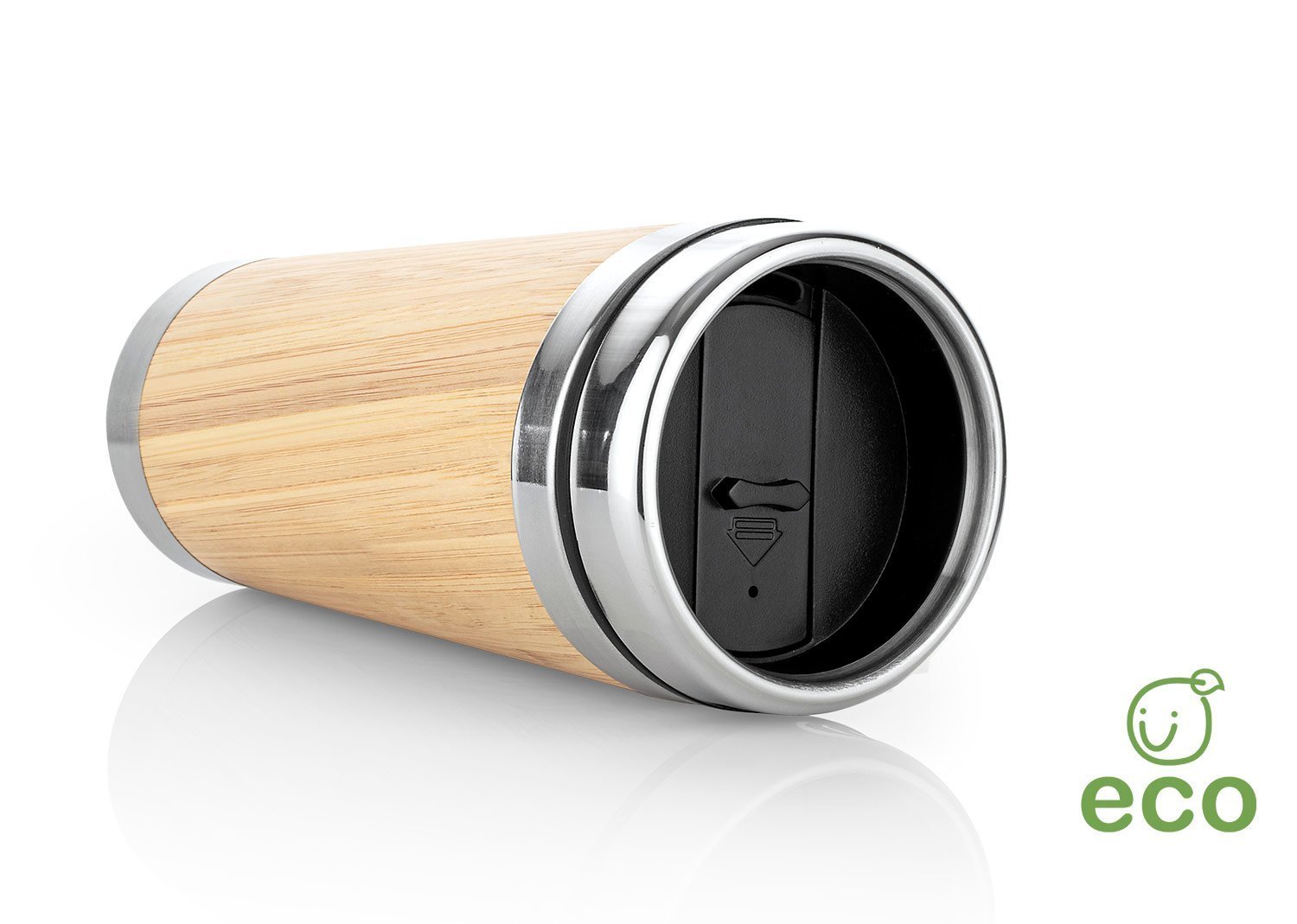 Mug en acero inoxidable y pared externa en Bambú. Con tapa corrediza a presión. Capacidad 450 ml / 15 Oz.