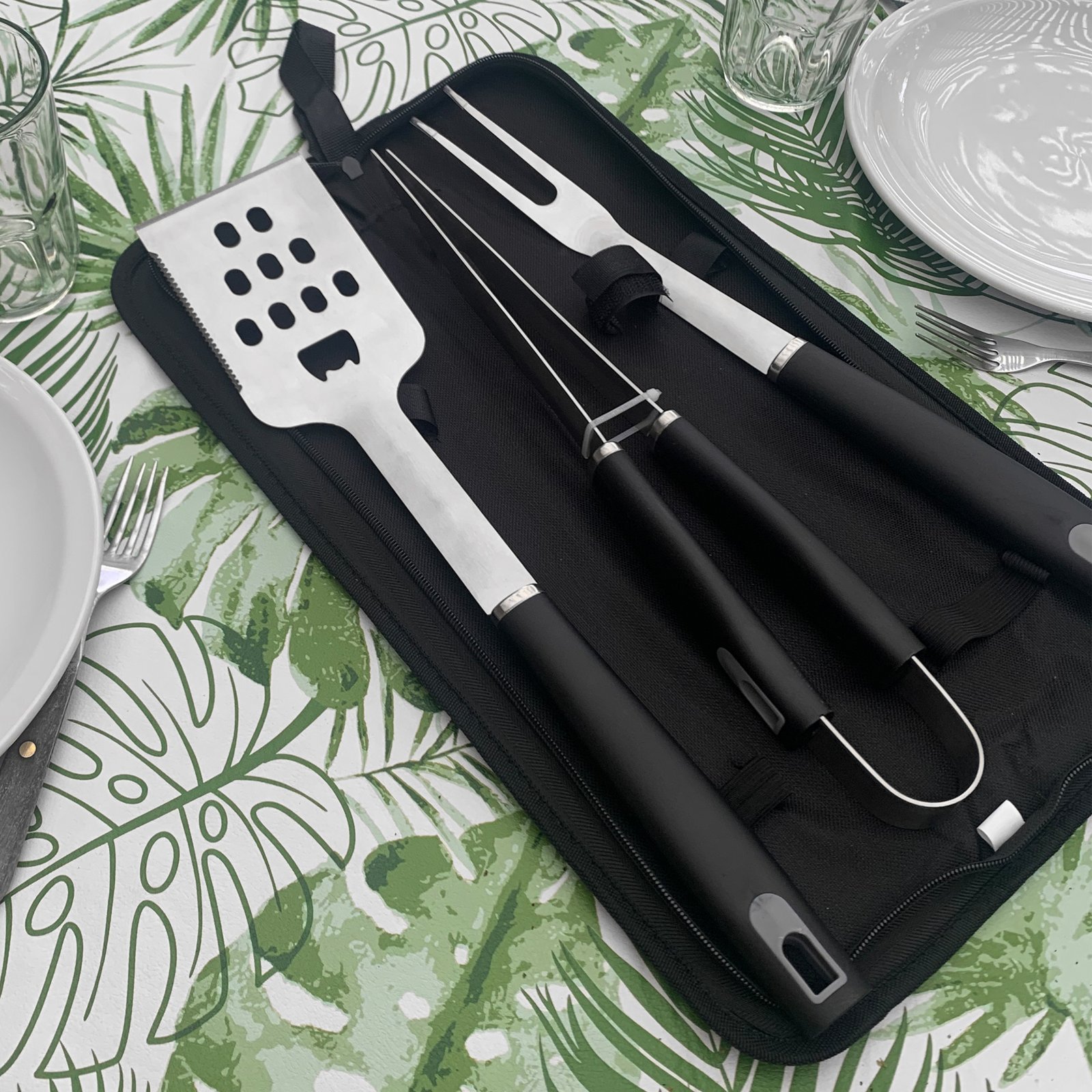 46,5 x 12 x 4,5 cm cerrado. Acero inoxidable y polipropileno + Poliéster. Set de asado en estuche color negro con cierre. Contiene 3 utensilios de acero inoxidable 420: tenedor de 135g y 41 cm de largo; pinza de 275g y 39 cm de largo; y espátula de 225g y 43 cm de largo, todos con mango de polipropileno en color negro. Espátula multipropósito (recoge, escurre, corta y destapa). Calidad premium. Estuche con cierre.