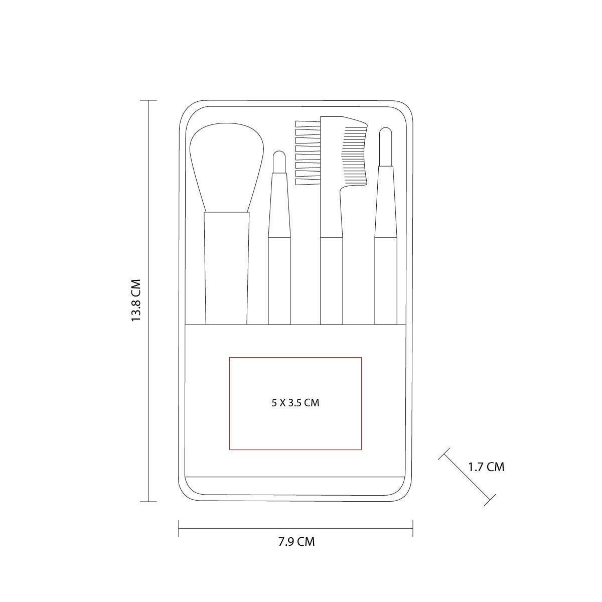 Estuche de plástico con 1 brocha para sombras, 1 brocha para labios, 1 brocha para rubor y 1 peine para cejas y pestañas.