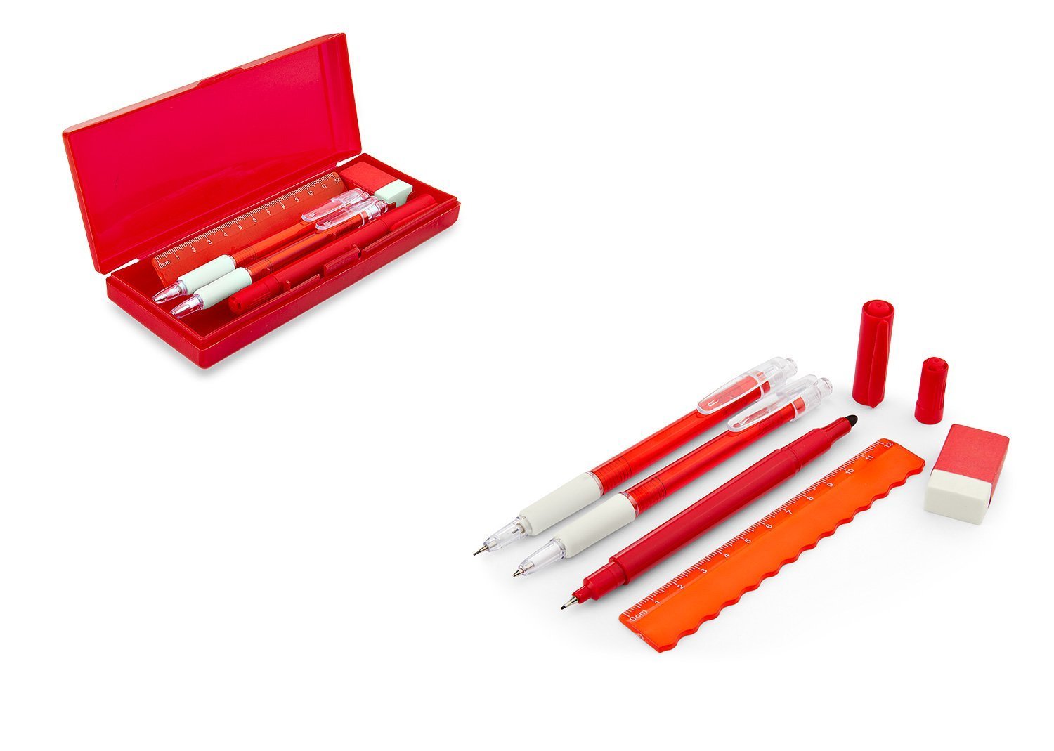 Set de escritorio en estuche plástico, contiene: resaltador, bolígrafo, portaminas, regla y borrador.