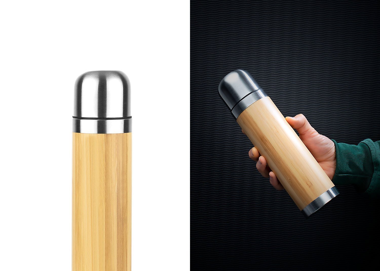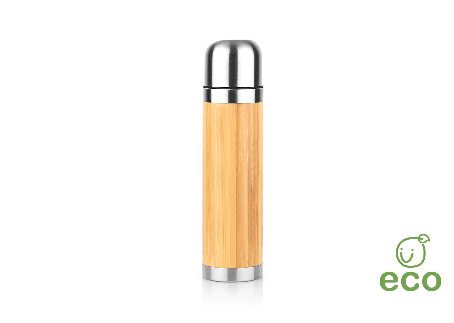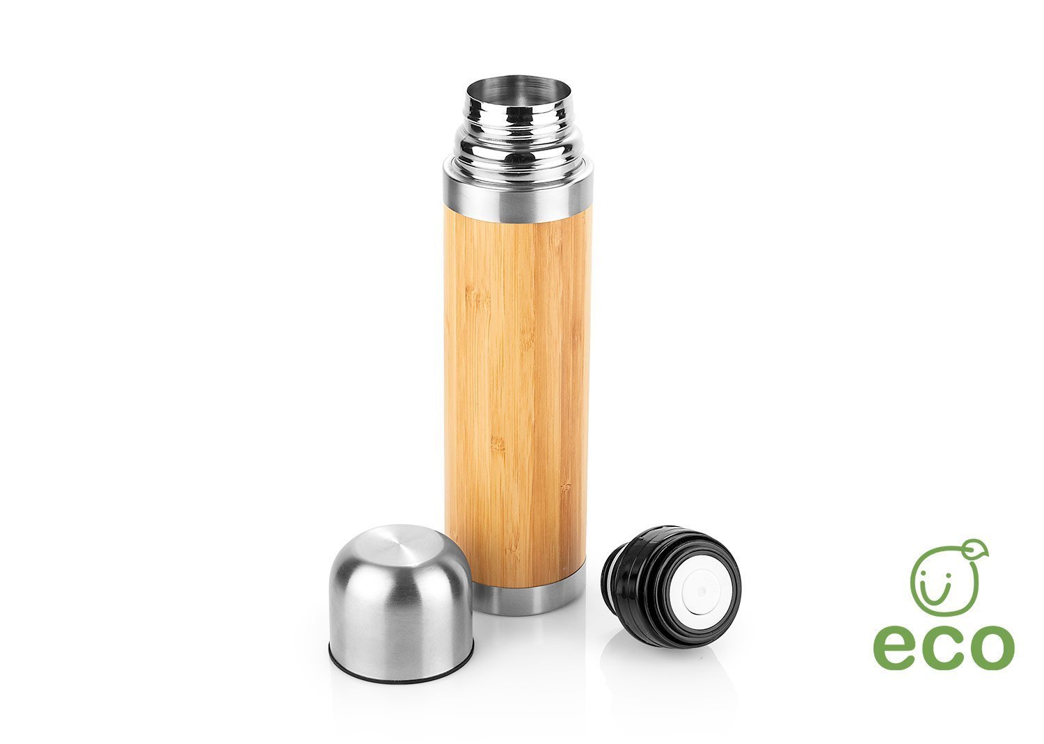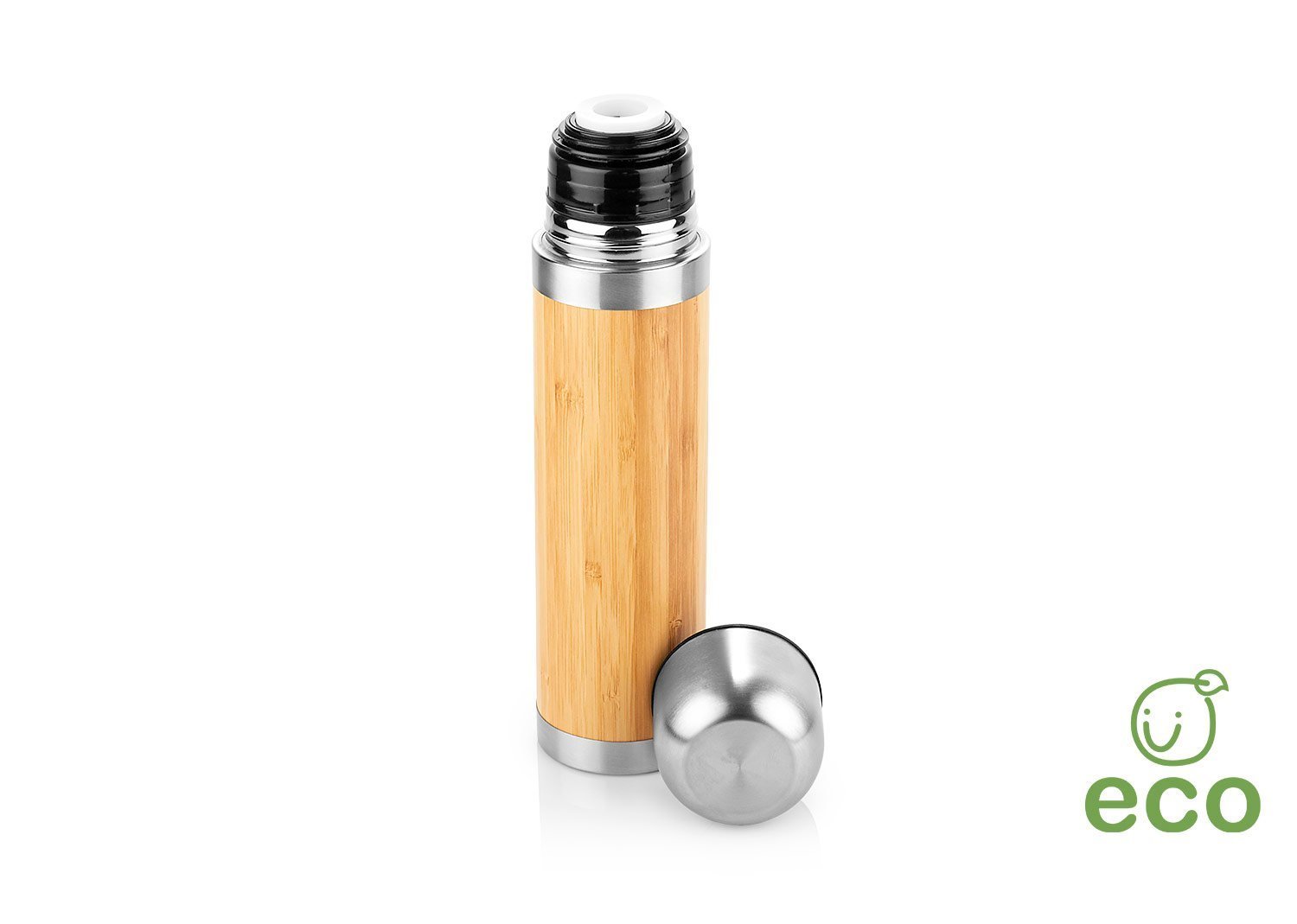 Termo en acero inoxidable con enchapado exterior en Bambú, Tapa rosca, la tapa se puede utilizar para tomar las bebidas, incluye filtro delgado. Capacidad 400ml / 14 Oz.