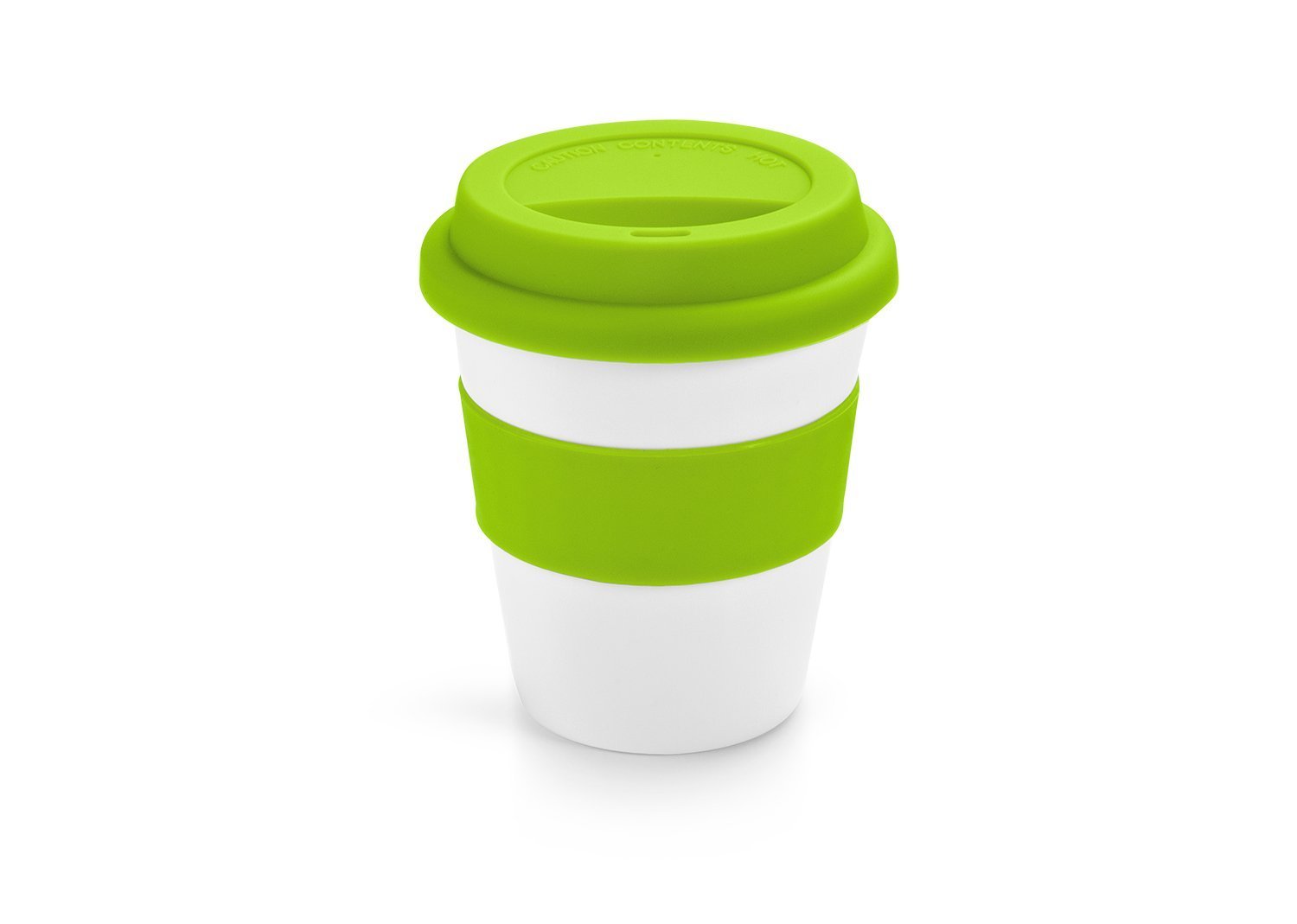 Vaso plástico con tapa y protector en silicona. Encaja en la mayoría de porta vasos de los autos. En PP Libre de BPA, ftalatos u otras sustancias nocivas. No retiene ni transmite sabores u olores. Capacidad 356 ml / 12 Oz.